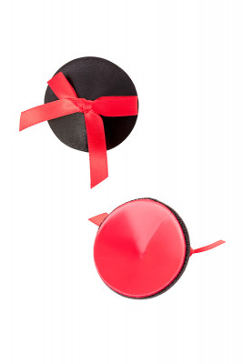 Наклейки на соски многоразовые. С контрастными бантиками. Конус выполнен из полиуретана, внутри — слой силиконового геля. Декор: искусственная кожа, сатиновые бантики.