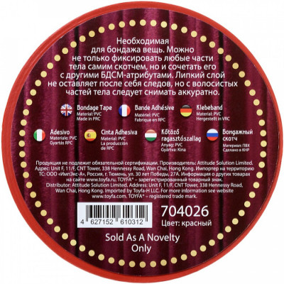 Необходимая для бондажа вещь. Можно не только фиксировать любые части тела самим скотчем, но и сочетать его с другими БДСМ-атрибутами. Липкий слой не оставляет после себя следов, но с волосистых частей тела следует снимать аккуратно.