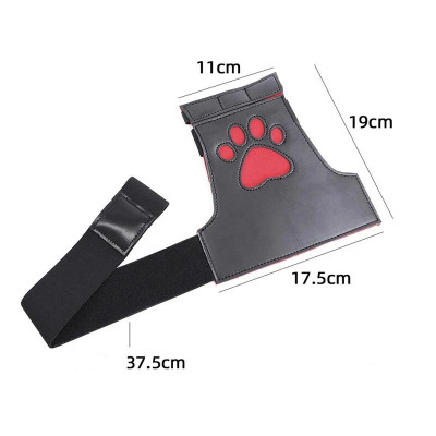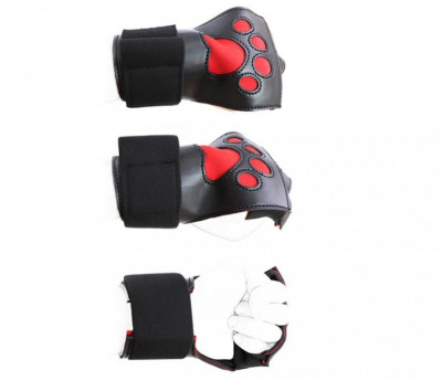 БДСМ накладки на руки из искусственной кожи с прокладкой из неопрена для мягкости, украшены с внешней стороны объемным трафаретом в виде собачей лапы. Для использования имеет три резинки для пальцев, резинку для ладони и широкая резинка для фиксации на запястье. Подойдет для ролевых игр, где партнер выполняет роль собаки раба.