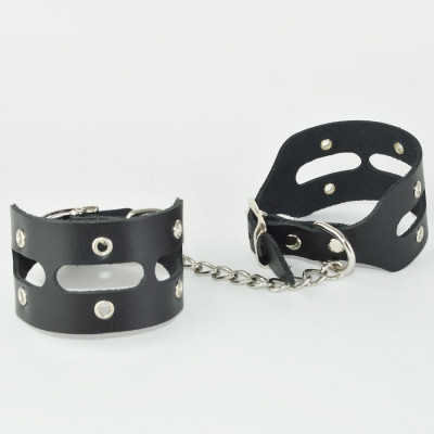 Наручники изготовлены из натуральной кожи. Размер регулируется при помощи металлической пряжки. Наручники соединены цепочкой.