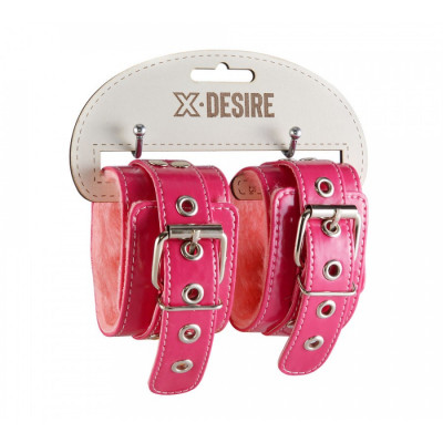 Наручники из искусственной лаковой кожи благородного розового цвета. Внутренняя сторона изделия отделана мягким искусственным мехом. Соединяются наручники при помощи перемычки с двумя карабинами.