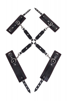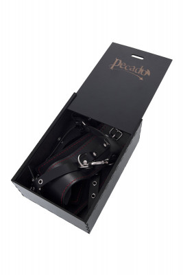 Комплект для бандажа состоит из четырёх кожаных ремешков в виде крестовины, с карабинами на концах, пары оков и пары наручников, всё это в фирменной деревянной коробке «Pecado BDSM».