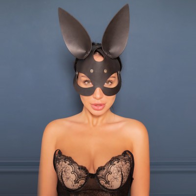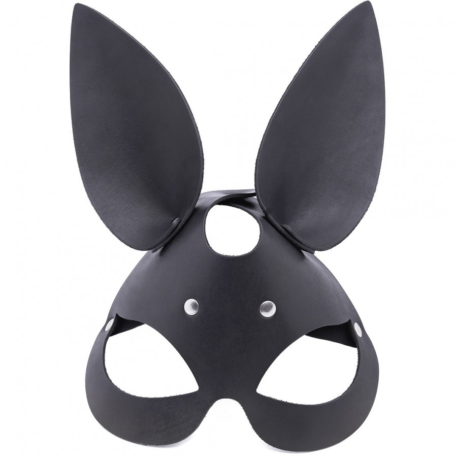 Женская маска чёрного цвета из натуральной кожи в форме Зайки с большими ушками. Сзади крепится на резинке. Стильный девичьи наряд для откровенной эротической игры! Серебристые заклепки добавляют шарма!