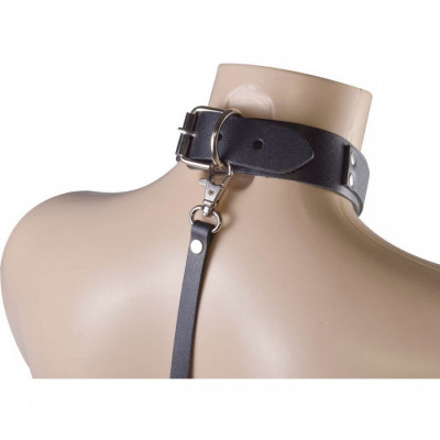 Ширина ошейника 3 см, длина металлической цепочки 40 см. Поводок кожаный.