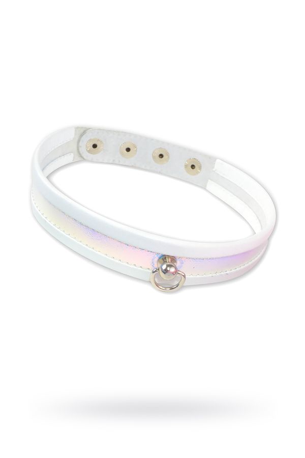 Узкий, аккуратный он плотно и комфортно прильнёт к Вашей шее. Скруглённые края ошейника придают ему рельефность, объёмность, а самое главное, не позволяют врезаться в нежную кожу шеи. Особенность данного ошейника в том, что он декорирован голографической вставкой, которая переливается нежными тонами: розовым, голубым, серебристым, сиреневым. Помимо собственных оттенков ошейник отражает окружающие цвета, что делает его колорит ещё богаче.