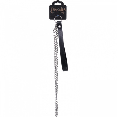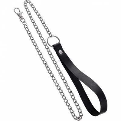 Кожаная рукоятка-петля с металлической цепью крепится к ошейнику или другим БДСМ-аксессуарам с помощью карабина.