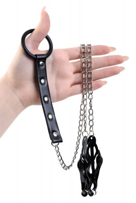 Мужская версия зажимов для воздействия на соски. Конструкция с пружинным механизмов - один из самых жестких вариантов. Дополнительное ограничение свободы обеспечивает мягкое кольцо на пенис.