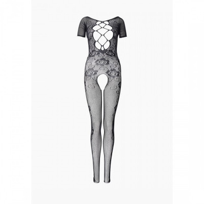 Черное прозрачное боди из нежного материала с узором в виде цветов. Имеет вырез на груди и открытую попку. Подходит на любую фигуру.