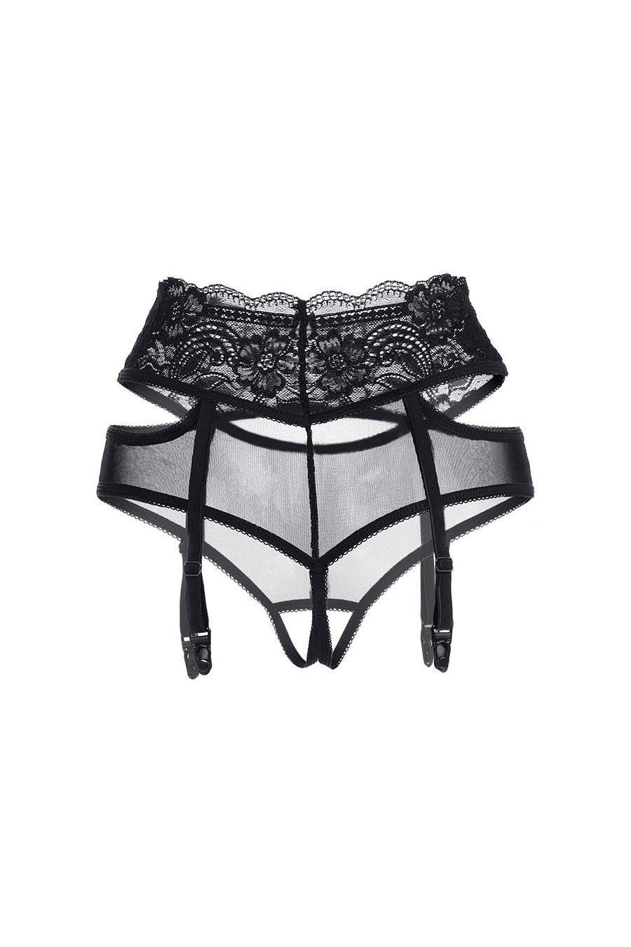 Эротические трусики-пояс для чулок Erolanta® Marianne из эластичной сетки со вставками кружева, с декоративными вырезами. Имитация пояса со свободным ажурным краем. Высокая посадка. Регулируемые пажи.