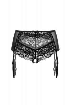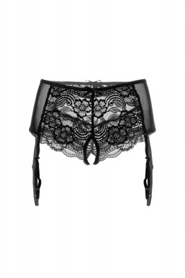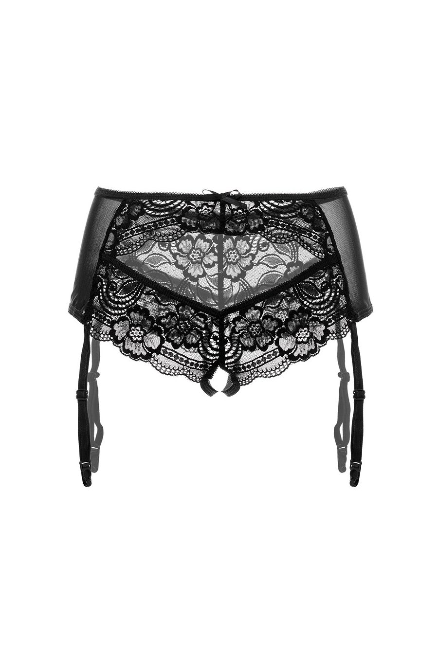 Эротические трусики-пояс Erolanta® Sheila, эластичные, из стрейч-сетки со сложными кружевными вставками, с вырезом сзади, без боковых швов, с атласными бантиками. Съемные регулируемые пажи.