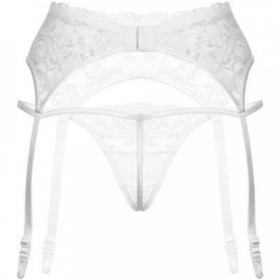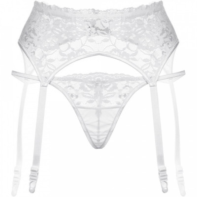 Комплект: пояс для чулок и стринги закрытые. Пояс выполнен из кружевного материала с цветочным арнаментом. Стринги из комбинированного материала: кружево (верхняя часть) и более плотная не прозрачная ткань (нижняя часть стрингов).