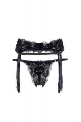 Комплект Erolanta® Tatyana: пояс для чулок и стринги кружевные, эластичные. Стринги со вставкой сеточки внутри, декорированы колечками, атласными бантиками. Пояс с ажурным верхним краем, на регулируемой застежке.