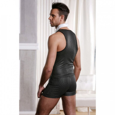 Костюм джентельмена из 3х предметов: эластичная жилетка и трусы-шорты украшены серебристыми пуговицами, воротник-галстук на застежке-липучке.