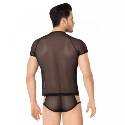 Экстравагантный комплект для смелых мужчин. Футболка и шорты выполнены из крупной эластичной сетки. Задняя часть трусов выполнена из мягкой мелкой сеточки, спереди вставка из такой же сеточки.