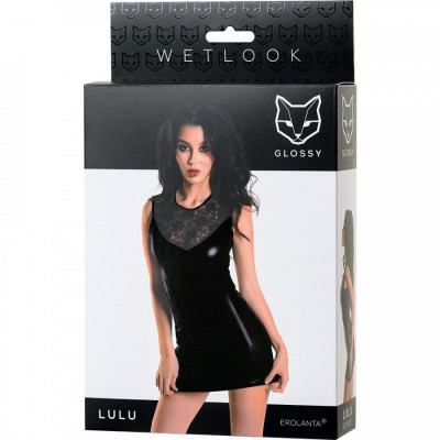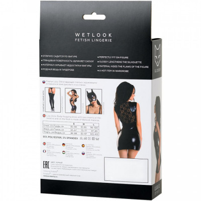Блестящее черное платье из материала wetlook с кружевными вставками. Сексуально обтягивает силуэт, а цветочное черное кружево в области декольте и на спине добавляет сексуальные акценты образу.