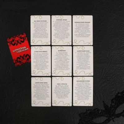 Внутри вас ждёт 10 карт с ролевыми играми. Внимательно их изучите и выберите ту, которую будете использовать сегодня. По желанию можно подготовить костюмы и реквизит, чтобы обеспечить полное погружение. Осталось только подарить друг другу незабываемые эмоции!