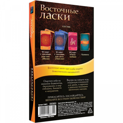 В комплекте: 10 карт с ласками для неё «Йони», 10 карт с ласками для него «Лингам», 20 карт «Позы любви», правила.
