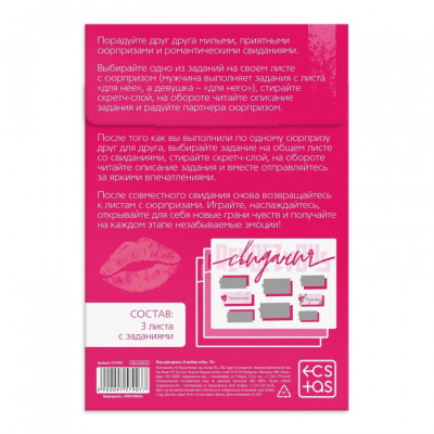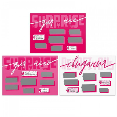 Порадуйте друг друга милыми свиданиями и приятными сюрпризами! Перед вами романтические задания, которые подарят каждому искренние и незабываемые эмоции. Наслаждайтесь друг другом, играйте, открывайте новые грани чувств и вместе отправляйтесь за яркими впечатлениями! Как пользоваться? Выбирайте одно из заданий: «для него» и «для нее», стирайте скретч-слой и выполняйте написанное. Дарите любовь и наслаждайтесь моментом!