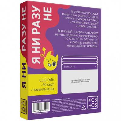Вы этого не делали? Не может быть! Игра, в которой твои секреты вырвутся наружу. Тебе придется сильно постараться, чтобы скрыть их от всех. Пикантные фразы, неловкие ситуации, непристойные истории станут разрушителями тайн, не оставляя тебе ни малейшего шанса. Тебя ждет 50 карточек с утверждениями, каждое из которых начинается с фразы: «Я ни разу не…» Игроки вытягивают их по одной и зачитывают. А каждый, кто хоть раз совершал указанное действие, должен выполнить наказание, а какое именно – решает ваша компания! «Я ни разу не…» – это идеальный способ заново познакомиться со старыми друзьями и узнать новых людей с необычной стороны!