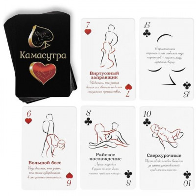 Игральные карты Камасутра 18+ помогут совместить карточную игру с изучением изысканных сексуальных поз. Колоду можно использовать для того, чтобы разнообразить досуг влюбленной пары, либо в раскованной компании с целью создания необходимой эротической атмосферы. На картах имеется текст с изложением интересных фактов из восточных сексуальных практик. Интересные, затейливые позы можно не только изучать, но и практиковать, когда возбуждение достигнет нужного уровня.