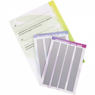 Внутри: Игра-плакат А2, Инструкция-договор согласия А5, Абонемент для нее А6, Абонемент для него А6.