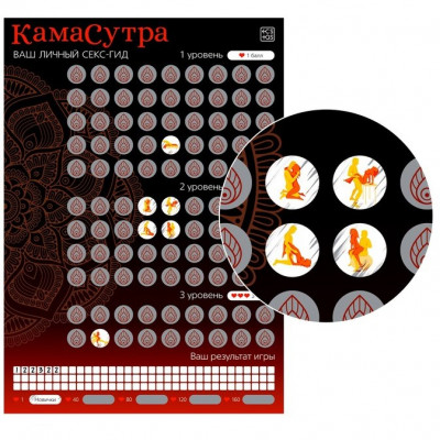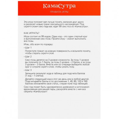 Как пользоваться плакатом? Игра состоит из 99 ходов. Один ход — это один стёртый круг и выполненная секс-поза. Пройти игру — значит выполнить все позы. Итак, обо всём по порядку: для начала поместите плакат на ровную поверхность и возьмите монету, чтобы стереть скретч-слой. Внутри вы найдёте: плакат формата А3 со скретч-слоем, правила игры.