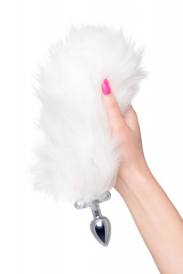 Анальная пробка из металла имеет съемный ограничитель. При желании вы можете использовать пушистый хвостик с тремя режимами подсветки или классический ограничитель со стразом.