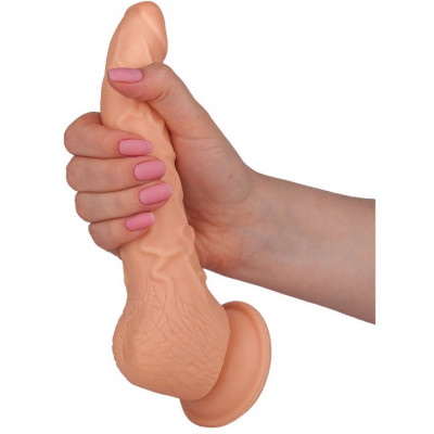 Фаллоимитатор имеет полужесткую структуру и искривлен таким образом, что полностью имитирует физиологическое положение мужского члена.