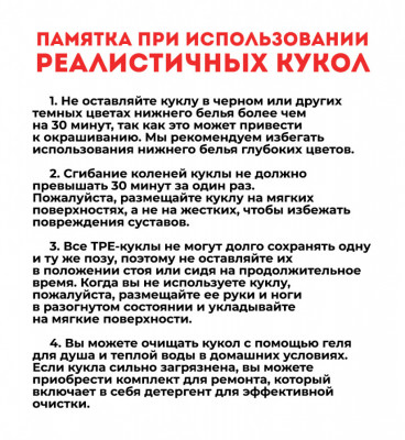 Кукла оснащена прочным металлическим каркасом, который обеспечивает ей отличную гибкость и возможность принимать разнообразные позы. Вы можете легко настроить ее положение, чтобы достичь максимального комфорта и удовольствия.