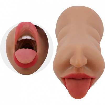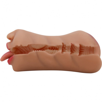 Двойной сквозной мастурбатор для мужского удовольствия. С одной стороны - это вагина с ярко выраженными половыми губами и внутренней рельефной поверхностью, с другой – сексуальный ротик с окрашенными губками, чувственным язычком и твёрдыми белыми зубками.
