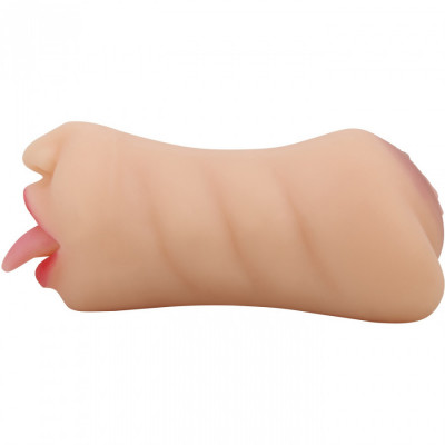 Двойной сквозной мастурбатор для мужского удовольствия. С одной стороны - это вагина с ярко выраженными половыми губами и внутренней рельефной поверхностью, с другой – сексуальный ротик с окрашенными губками, чувственным язычком и твёрдыми белыми зубками.