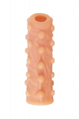 Насадка имеет форму “рукав”, плотно прилегает к пенису, создавая дополнительную толщину и оставляя головку открытой. Это позволяет сохранить чувствительность головки, задерживая эякуляцию. В основании есть отверстие для мошонки, с помощью которого вы надежно зафиксируете насадку на пенисе, не ограничиваясь в активных движениях. Насадка, за счет плотного облегания мошонки и головки, усиливает эрекцию.