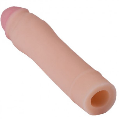 Фаллоудлинитель надевается на пенис и увеличивает его как в длину, так и в диаметре. Интимный аксессуар полностью повторяет рельеф мужского полового органа и имеет реалистичную головку красивой формы с четко очерченным краем. Под ней заметны складки, имитирующие крайнюю плоть и утолщение, усиливающее стимуляцию при фрикциях.