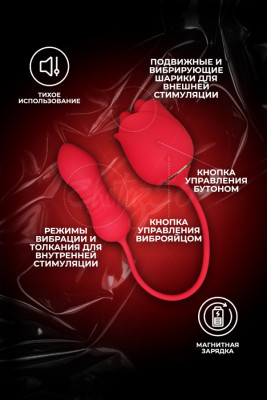 Эта секс-игрушка сочетает в себе виброяйцо и стимулятор клитора в виде розочки, благодаря чему подарит наслаждение сразу в двух зонах. Каждая из частей игрушки управляется по отдельности и имеет 9 режимов работы. Вибрация и ротация для бутона и вибрация и толкание для яйца.