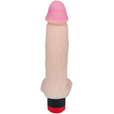 Вибромассажёр телесного цвета. Имеет форму члена с мошонкой и ярко-выраженной головкой. Необычайно приятный, рельефный, выполненный из «Киберкожи», передающий эффект мягкой реалистичной текстуры кожи, не имеет швов. Виброэлемент расположен по всей длине изделия. Степень вибрации регулируется при помощи кнопки, расположенной в основании.