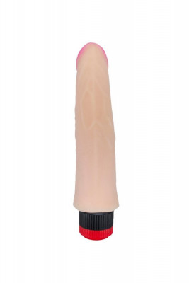 Вибромассажёр телесного цвета. Имеет форму члена с ярко-выраженной головкой. Необычайно приятный, рельефный, выполненный из «Неоскин», передающий эффект мягкой реалистичной текстуры кожи, не имеет швов. Виброэлемент расположен по всей длине изделия. Степень вибрации регулируется при помощи кнопки, расположенной в основании.