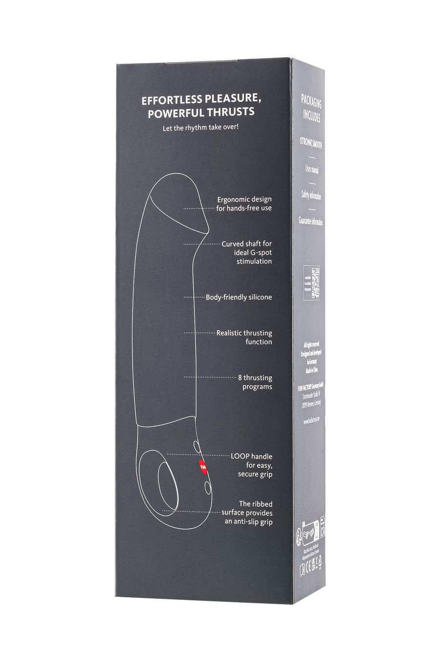 Жаждете чего-то нового? С 8 уникальными режимами поступательных движений, включая 4 скорости и 4 ритма пульсации, вы полностью контролируете интенсивность. Интуитивно понятное управление и эргономичная рукоятка LOOP с ребристой нескользящей текстурой легко регулируются, позволяя вам полностью отдаться своим желаниям. А что касается игр с партнером? STRONIC SMOOTH выводит удовольствие на новый уровень, добавляя еще больше острых ощущений в каждый момент.