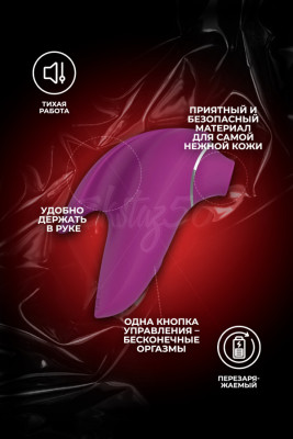 Вакуумный механизм нежно присасывается к чувствительным зонам тела, после чего воздушные колебания ласкают клитор, активируя нервные окончания и вызывая почти мгновенный оргазм. Такой вид интимной стимуляции абсолютно безопасен, так как исключает трение.